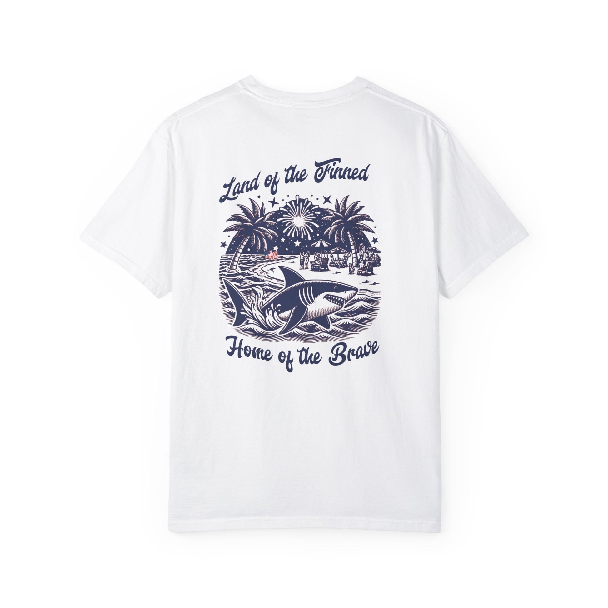 Turn heads and embrace the holiday spirit with the "Freedom Fins Tee." On the back, a dynamic scene features a fierce shark swimming amidst fireworks, with beachgoers enjoying the 4th of July festivities. The phrase "Land of the Finned and Home of the Brave" boldly complements the design, making it a standout piece for any patriotic event.